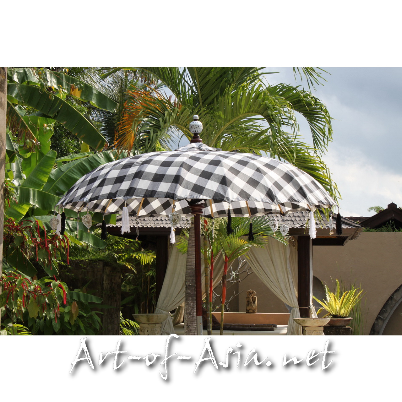 Unser Bali Sonnenschirm - eine Kostbarkeit, die viel edler als jeder Standard-Hightech-Schirm ist. Schützen Sie Ihren Schirm deshalb bitte vor zu starkem Wind und Regen - so werden Sie sehr lange Freude an diesem Kunstwerk haben.